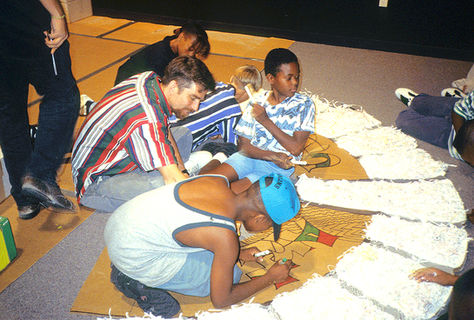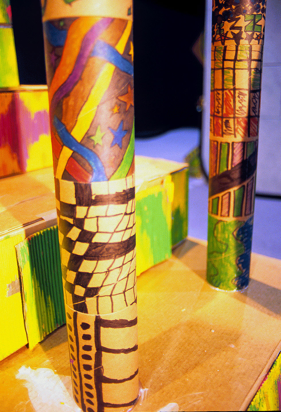 A cardboard clubhouse created for a public space in Las Vegas. The goal, in this collaboration with 10-14 year olds, is to convey the built environment as something that's changeable rather than automatically there. The hook for the kids, who come from Vegas's low-income housing projects, is the chance to make something in public space - a large youth creation dominating in a beautiful lobby shared by a museum and a library.